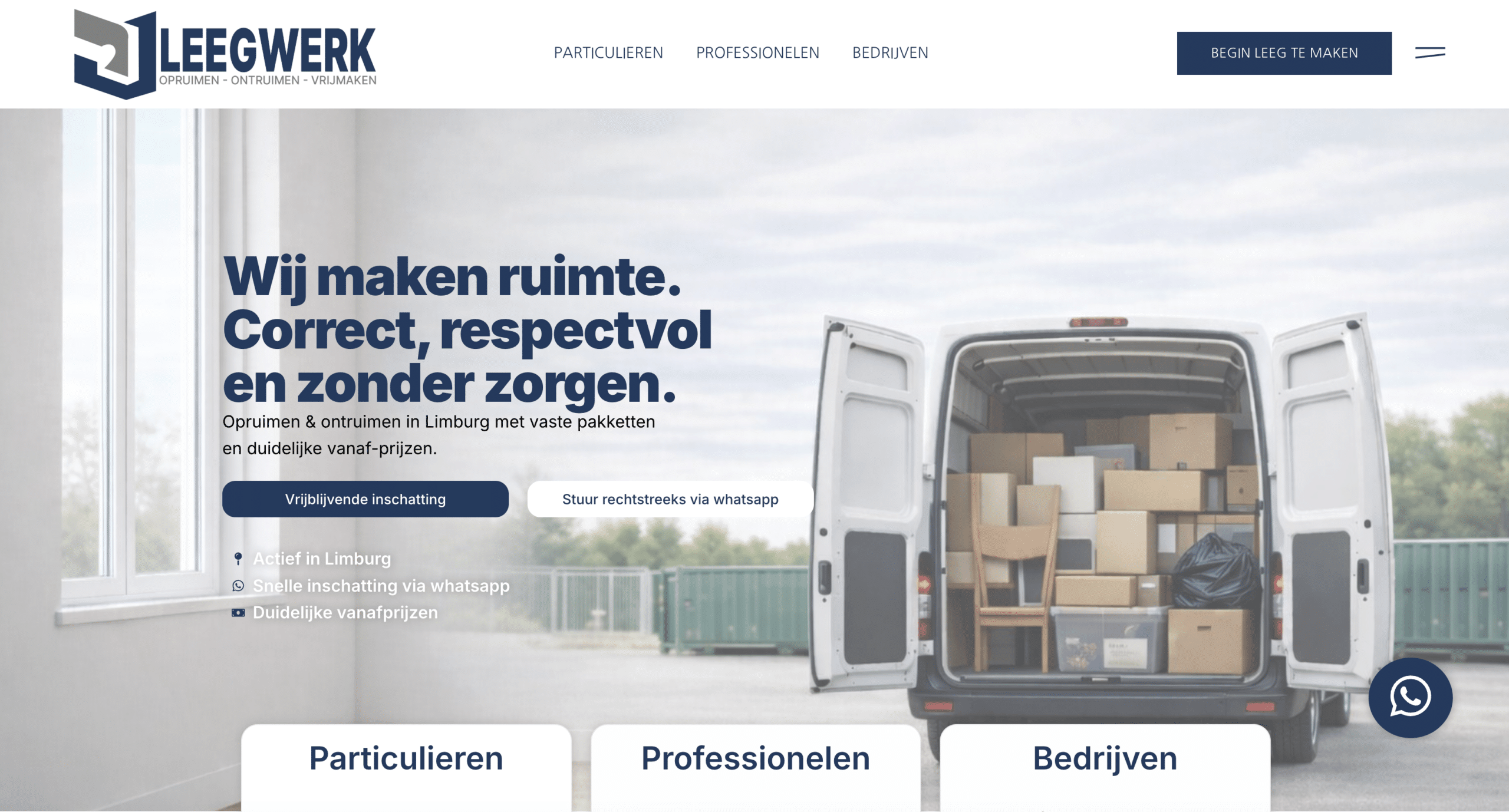 Leegwerk had nood aan een website die meteen vertrouwen uitstraalt en bezoekers overtuigt om contact op te nemen voor ontruimingen en leegwerk. Wij bouwden een conversiegerichte website die duidelijkheid, professionaliteit en snelheid communiceert.